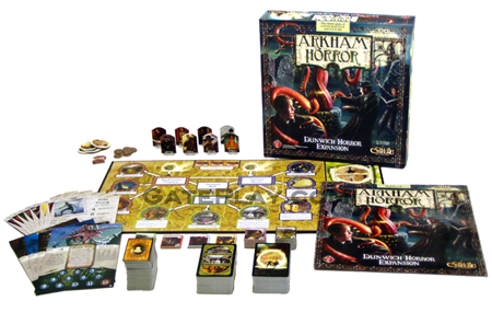 | Drake says: "Dunwich is a big-box expansion for Arkham Horror. This expansion adds 8 new Investigators, 4 Ancient Ones, 15 Item cards, 25 Unique Item cards, 21 Spell cards, 11 Skill cards, 5 Ally cards, 4 Condition cards, 28 Monster tokens, 36 Mythos cards and 32 Gate cards to the base set. It also adds new location cards, for a total of 14 cards at each location instead of 7. Dunwich Horror also adds new mechanics including one in which players may take a train to Dunwich."