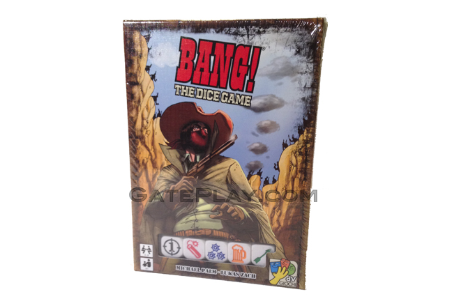 Designer: Michael Palm Lukas Zach Description: In the U.S. wild west, the eternal battle between the law and the outlaws keeps heating up. Suddenly, a rain of arrows darken the sky: It's an Indian attack! Are you bold enough to keep up with the Indians? Do you have the courage to challenge your fate? Can you expose and defeat the ruthless gunmen around you? Bang! The Dice Game keeps the core of the Bang! card game in place. At the start of the game, players each take a role card that secretly places them on a team: the Sheriff and deputies, outlaws, and renegades. The Sheriff and deputies need to kill the outlaws, the outlaws win by killing the Sheriff, and the renegades want to be the last players alive in the game. Each player also receives a character card which grants him a special power in the game. The Sheriff reveals his role card and takes the first turn of the game. On a turn, a player can roll the five dice up to three times, using the results of the dice to shoot neighboring players, increase the range of his shots, heal his (or anyone else's) life points, or put him in range of the Indians, which are represented by nine tokens in the center of the table. Each time a player rolls an arrow, he takes one of these tokens; when the final token is taken, each player loses one life point for each token he holds, then the tokens are returned to the center of the table. If a player collects a trio of Gatling symbols on the dice, he fires one shot at everyone else and rids himself of Indian tokens. Who'll get his shot off first? Play continues until one team meets its winning condition – and death won't necessarily keep you from winning as long as your teammates pull through!