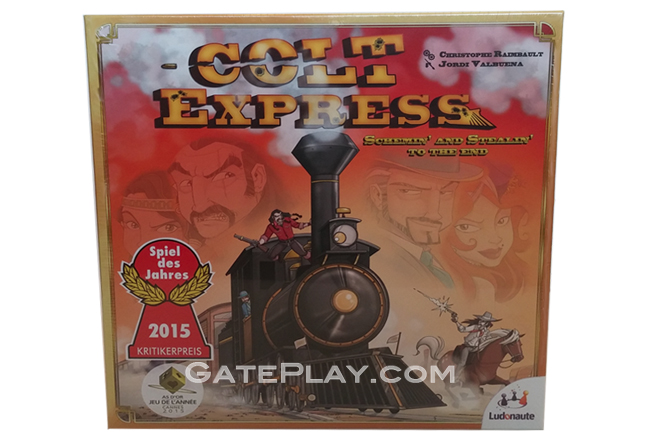 Designer: Christophe Raimbault Description: The game consists of five rounds, and each round has two phases: Phase 1: Schemin' Each player plays 2-5 action cards on a common pile, with the cards being face up or face down depending on the type of the round. Instead of playing a card, a player can draw three cards from her deck. Phase 2: Stealin' The action cards are carried out in the order they were played, with a player's best laid plans possibly not panning out due to mistakes and oversights! The game takes place in a 3D train in which the bandits can move from one car to another, run on the roof, punch the other bandits, shoot them, rob the passengers, or draw the Marshal out of position. The train has as many cars as the number of players, and each car is seeded with gems, bags of loot or suitcases at the start of play. Each player starts a round with six cards in hand, with each card showing one of these actions. At the start of a round, a round card is revealed, showing how many cards will be played; whether they'll be played face up or face down, or individually or in pairs; and what action will occur at the end of the round (e.g., all bandits on top of the train move to the engine). You can pick up loot, gems or suitcases only by playing a "steal" card when you're in a train car that holds one of these items — but since everyone is planning to get these goods, you'll need to move, punch and shoot to get others out of your way. You can punch someone only in the same car as you, and when you do, the other bandit drops one of the goods he's collected and is knocked into an adjacent car. Each player's character has a special power, such as starting the round with an extra card, playing your first card face down, or pocketing a bag of loot when you punch someone instead of letting it hit the ground. You can shoot someone in an adjacent car or (if you're running on top of the train) anyone in sight, and when you do, you give that player one of your six bullet cards; that card gets shuffled in the opponent's deck, possibly giving her a dead card in hand on a future turn and forcing her to draw instead of playing something. If the Marshal ends up in the same car as you, likely due to other bandits luring him through the train, he'll be happy to give you a bullet, too. At the end of the game, whoever fired the most bullets receives a $1,000 braggart bonus, and whoever bagged the richest haul wins!