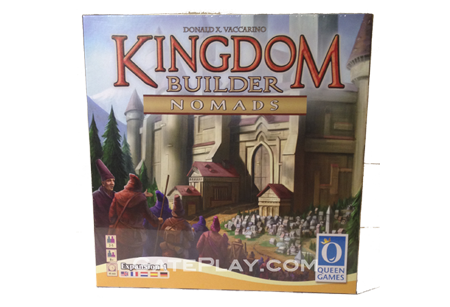 Designer: Donald X. Vaccarino Description: Kingdom Builder: Nomads provides more options and more variety for Donald X. Vaccarino's Kingdom Builder, with four new game boards - and consequently four new powers associated with their respective game boards, such as the power to place one or two stones from a quarry on empty spaces to block them. Three additional Kingdom Builder scoring cards are included to provide new scoring opportunities during game play, and red houses are included to allow for up to five to play. The new game boards replace the castle spaces from the base game (which score three points for anyone adjacent to them) with nomad spaces. During set-up, in which four game boards are chosen at random from all available boards, a randomly chosen nomad tile is placed on each nomad space. The first player to build a settlement adjacent to a nomad space takes this tile and must use it during her next turn; the tile is removed from the game after her next turn, whether she used it or not. Nomad tiles allow a player to build three settlements on the specified terrain, move settlements, build without following the adjacency rule, remove another player's settlement, or score points. The new scoring cards give points as you place settlements during your turn, specifically for placing settlements in a straight line, for placing settlements next to those of other players, and for placing settlements on terrain that's not adjacent to empty terrain of the same type. (Replacement scoring cards for "Workers" and "Merchants" are included in Kingdom Builder: Nomads and should be used in place of those in the base game. These cards merely reflect the fact that the expansion boards have Nomad spaces which also count for scoring for these cards.) In addition to the quarry power – which both helps block opponents and fill spaces in which you don't want to place settlements – the new location powers allow you to place a settlement in the flower fields, to place a settlement adjacent to at least three of your own settlements, and to move a settlement in a straight line on the board until it hits an obstacle.