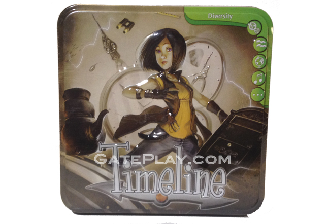 Designer: Frédéric Henry Description: Timeline: Diversity is a card game played using 110 cards. Each card depicts a historical event on both sides, with the year in which that event occurred on only one side. Players take turns placing a card from their hand in a row on the table. After placing the card, the player reveals the date on it. If the card was placed correctly with the date in chronological order with all other cards on the table, the card stays in place; otherwise the card is removed from play and the player takes another card from the deck. The first player to get rid of all his cards by placing them correctly wins. If multiple players go out in the same round, then everyone else is eliminated from play and each of those players are dealt one more card for another round of play. If only one player has no cards after a bonus round, he wins; otherwise play continues until a single player goes out. Timeline: Diversity can be combined with any other title in the Timeline series.